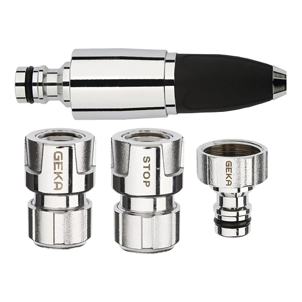 The tap connector and the hose piece can easily be connected to a tap and hose. The piece of hose with a water stop is attached to the end of the hose to make it easy to change equipment without losing water. All the parts are made of chrome-plated brass and are therefore extremely durable.