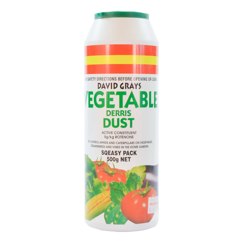 DAVID GRAYS Vegetable Dust is a low toxic treatment for controlling insect pests such as aphids and caterpillars in vegetables and other edible plants.